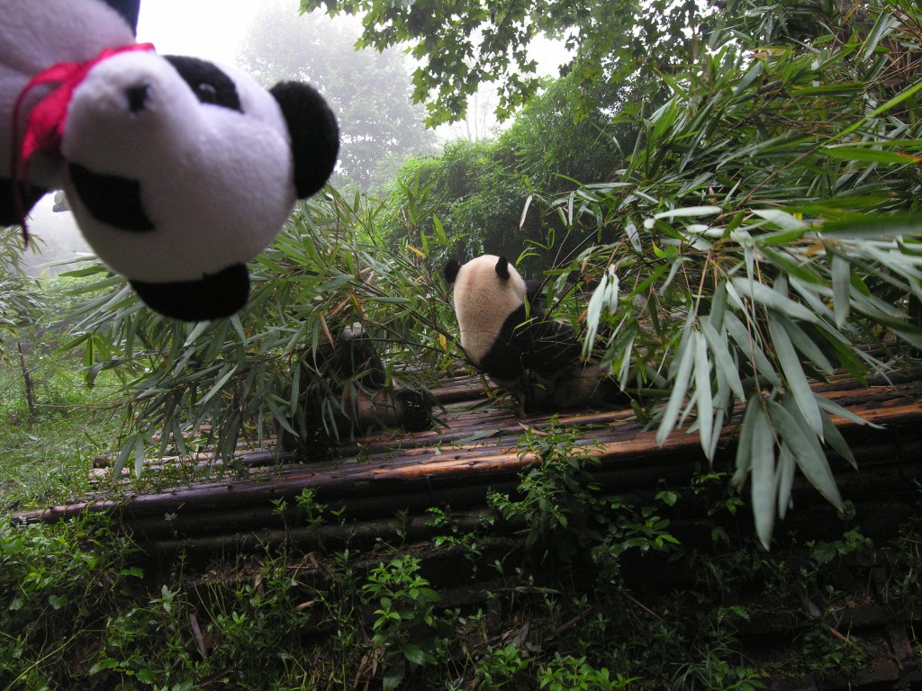 Lucky and a cousin panda Published September 4, 2009 at 1067 × 800 in Pandas In China Lucky the rescued panda sees his first real panda in Chengdu, China and the Giant Panda Breeding Center